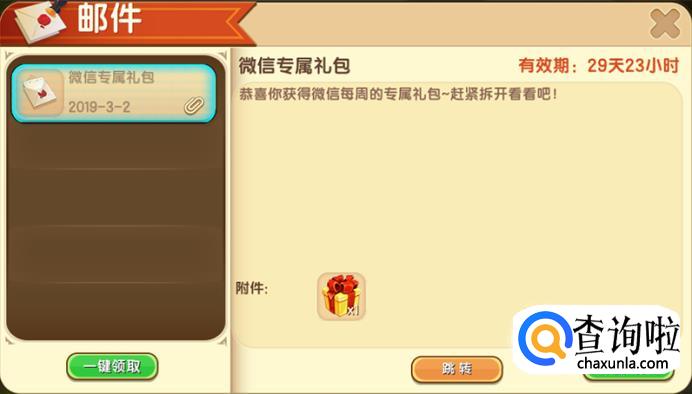 再次回到游戏邮箱,可以看到有礼包发送到邮箱了,点击领取就领到了,如果回到邮箱没有的话可以稍等下,有时候会慢一点。