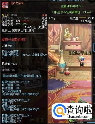 武器方面可以选择85级传说光剑“浸夜之余晖”,装备效果【黑暗释放】暴击伤害增加量+10%。