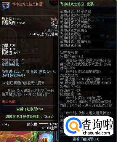 下装方面不用多说,自然是海神腿,除BUFF技能外还可以提升一些小技能的技能等级,而且在当前版本获取较为容易,只需一周便可轻松获得。
