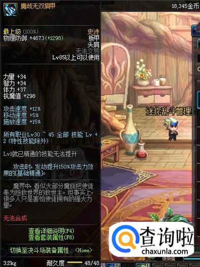 头肩方面优选85级SS板甲“魔战无双肩甲”,所有职业LV30~45全部技能LV+2(特性技能除外 )。