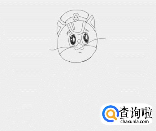 再在面部上画出黑猫警长的眉毛,然后在眉毛下面画出黑猫警长的眼睛,鼻子和嘴巴,然后再在嘴巴的两侧画出胡须,如图所示: