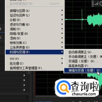 鼠标放在“时间与变调”这里,右侧即弹出子菜单再“伸缩与变调”