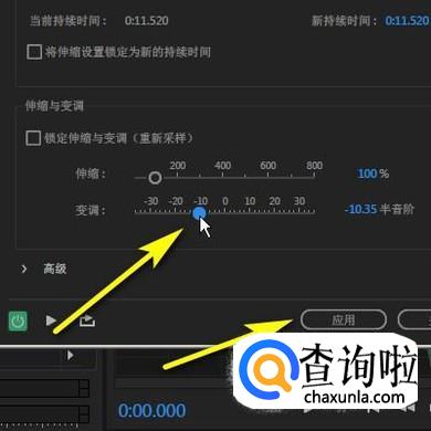 弹出对话框;在对话框中设置“变调”的参数;比如,我的声音是女声,想变调成低沉的近似于男声。那么,就把变调的参数设置为小于0的,即时负数。接着,点应用即可。
