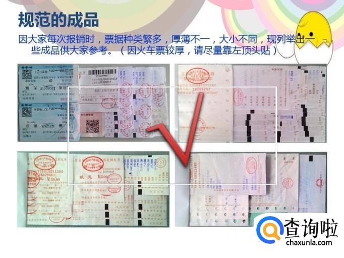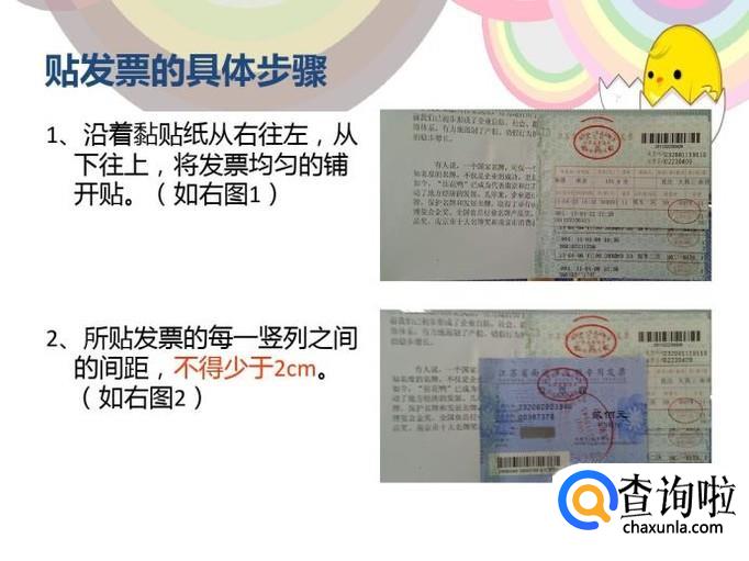 按照从右往左,从下到上的方向将发票贴到黏贴纸上,每一竖列间距不得小于两厘米,如果是火车票的话,间距不得少于三厘米。