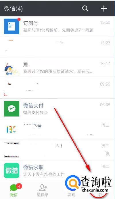 登录手机上的微信之后,在主界面点击右下角的“我”选项卡。