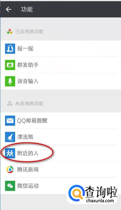 在“未启用的功能”下方,点击“附近的人”。