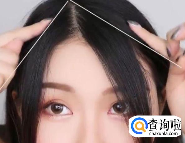 先把耳朵往上到头顶、耳前的发丝都拉出来,通常空气刘海的区块只在中间正三角,但咱们这款刘海的角度要再大一点,发量约耳前一小束的量。