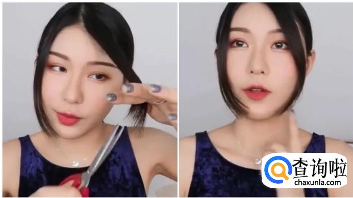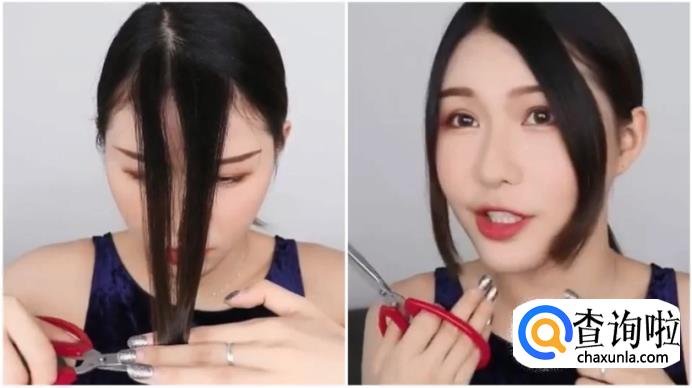 放开后发尾是整齐的状态,一看就知道自己剪的,而且这样上卷也不好看,所以需要修剪打薄才自然,把刘海拉直、剪刀改成直着拿,由下往上打薄修剪,记得外面长度要长,越往里边修越短。