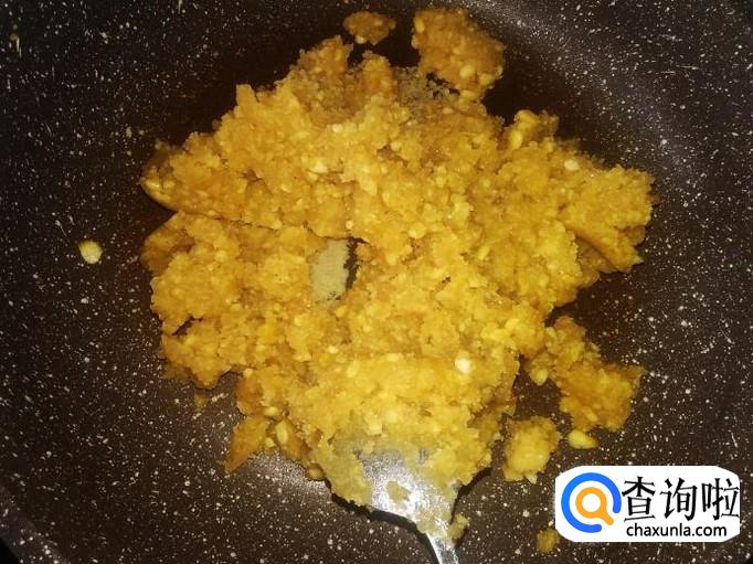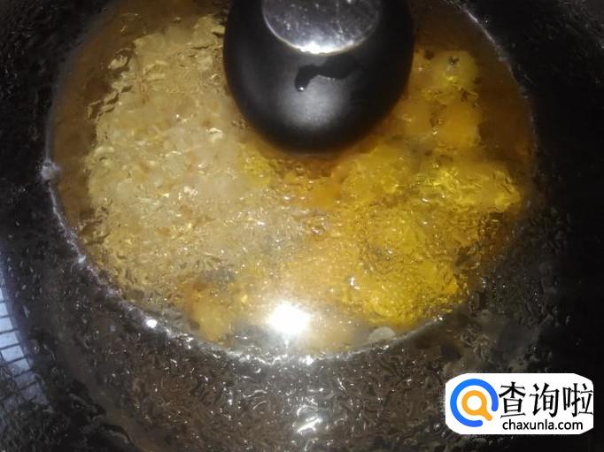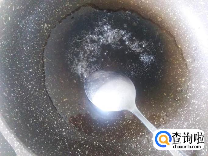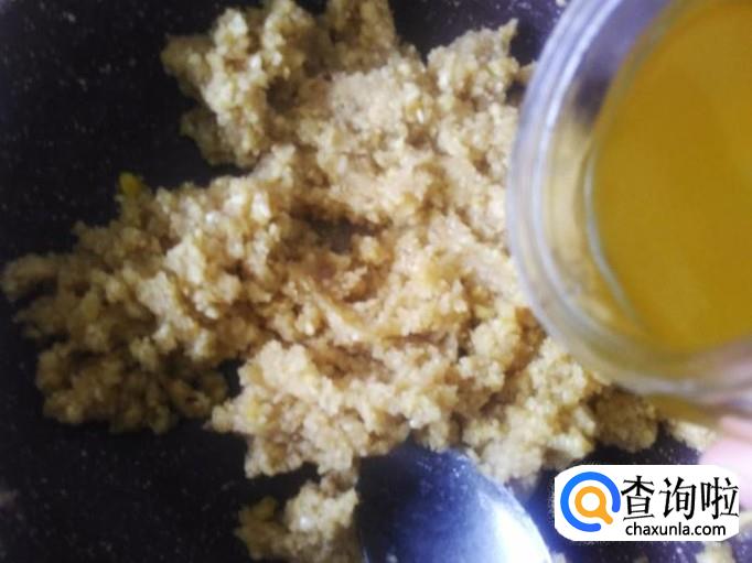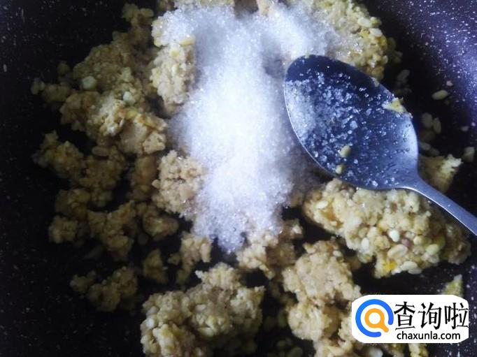 开火下油,然后把绿豆、板栗粉末倒到锅里,加50克左右的白糖。
