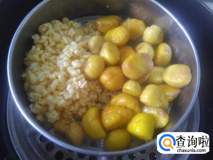 把板栗、绿豆放到过滤器,然后放到锅里大火蒸20分左右。