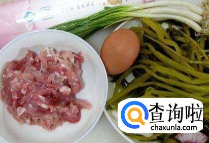 将肉切成均匀的丝,青菜用水焯一下,再准备鸡蛋和葱。