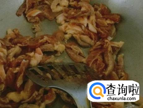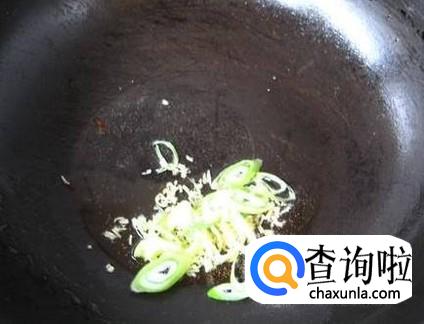 锅中放入食用油,油热后,下入葱花炝锅,然后放入肉丝、酱油煸炒。