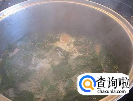 再锅中加入适量的水,煮开后,放入青菜,淋上鸡蛋液,再加入适量的盐,调一下味,等肉、菜、蛋都煮熟后,将汤倒入面条碗中,一碗鸡蛋肉丝面就做好了。