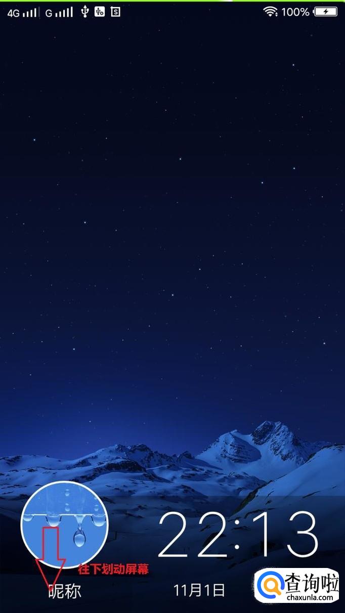 然后,我们就看到,锁屏界面变成如图所示的样式。我们从图中头像处,轻轻往下划动屏幕。