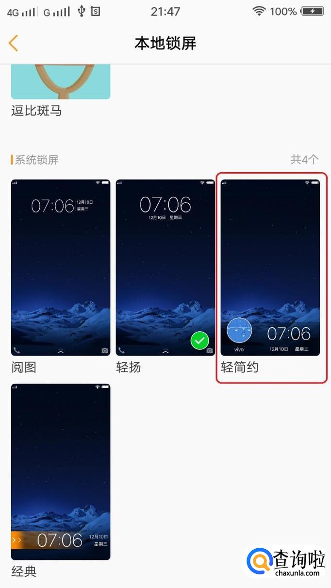 要更换锁屏头像,我们得把锁屏换成“轻简约”形式,如图所示,点击“轻简约”模式,并应用。