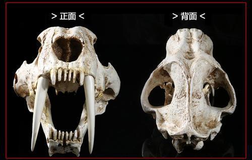 上图为剑齿虎头骨模形。右侧头顶视角图可见一对巨大的颞颥孔。