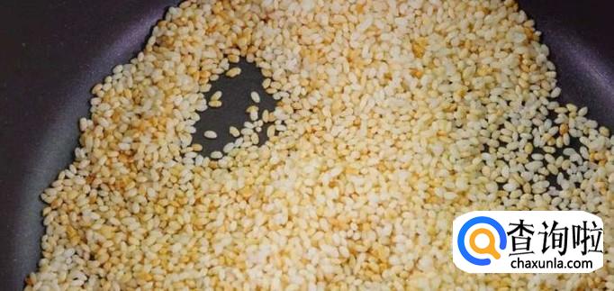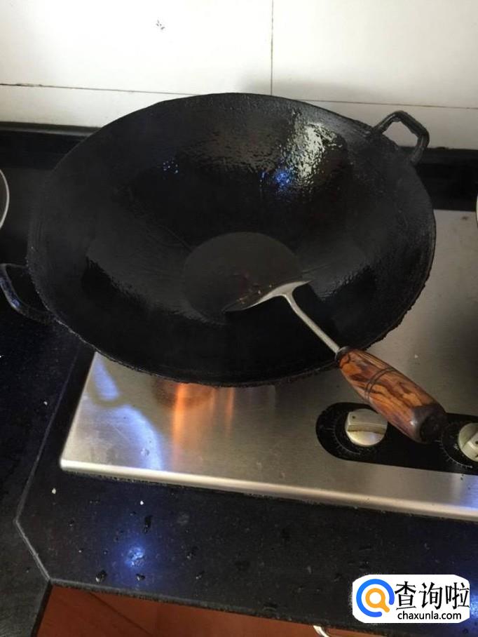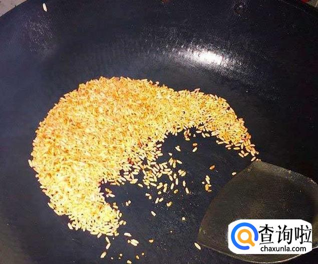 然后把炒锅用中小火加热,锅热后,往锅里倒少许油,放大米粒并搅拌一下。