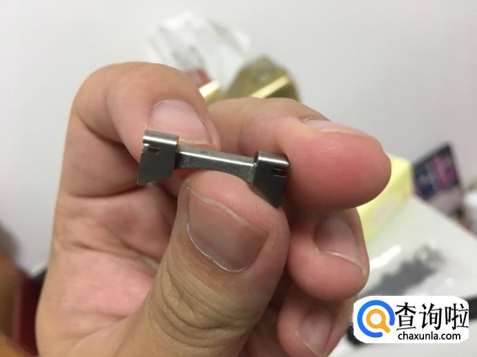 可以看到,能够使表带固定在表盘上的结构是插销的作用,那么我们要做的就是用拆表工具将金属表带拆下,把皮质表带挂上去。