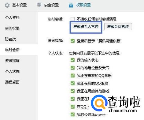 然后点击屏蔽联系人管理,如下图所示。