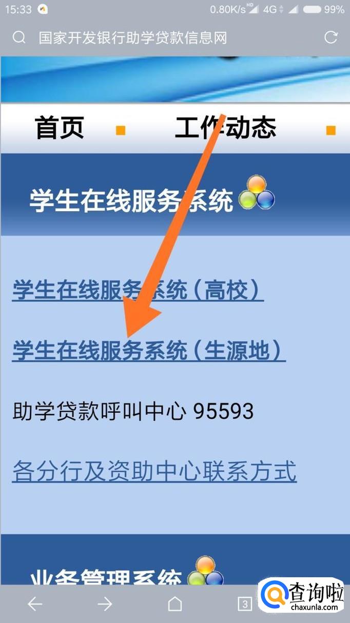 首先使用电脑(手机不一定打的开)打开国家开发银行贷款系统的官方网站,点击“学生在线服务系统(生源地)”。