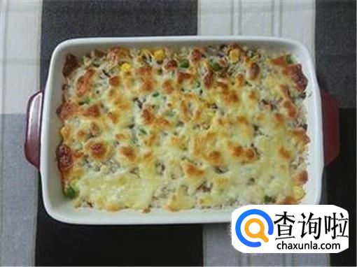 因为米饭和原材料都是煮熟的,所以我们只要五分钟左右,芝士焗饭就熟了,一个简单的芝士焗饭就制作完成了。