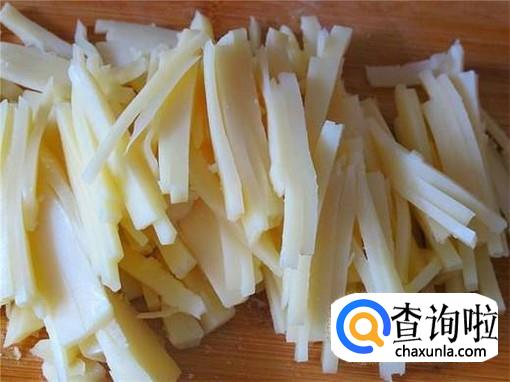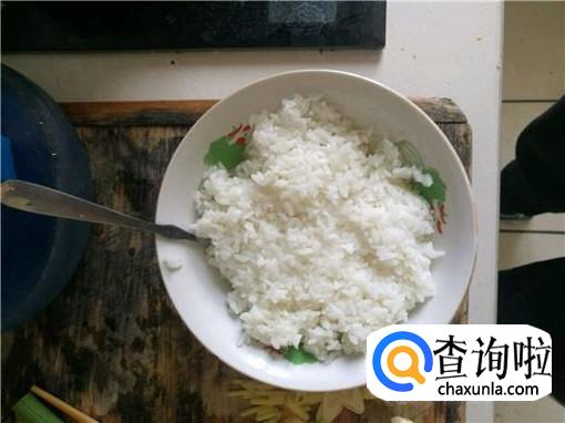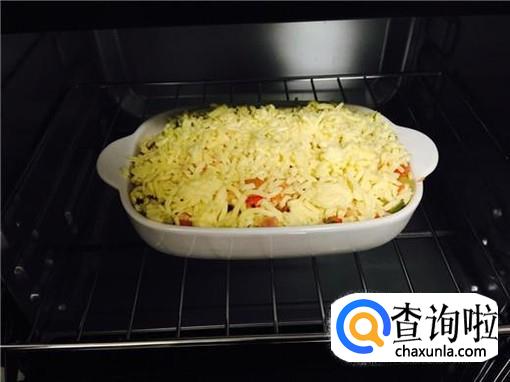 另外,还要将芝士切成细丝,将炒好的饭倒入盘中,并将芝士铺在表面,放入烤箱开始烤制。
