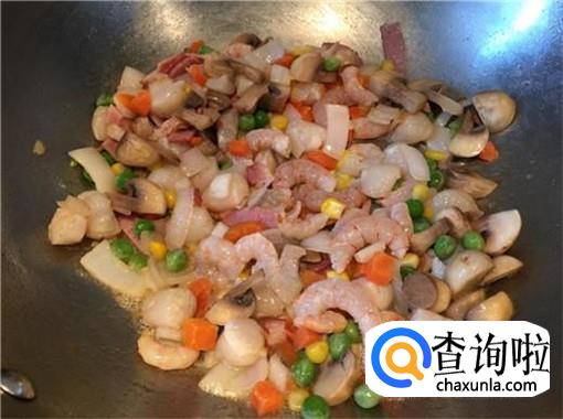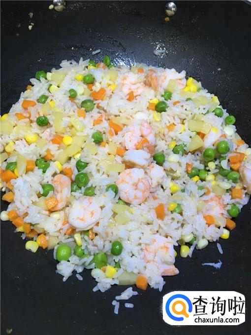 在锅中倒入适量的食用油,然后先将胡萝卜、玉米、豌豆和虾仁一起倒入翻炒,再倒入米饭。