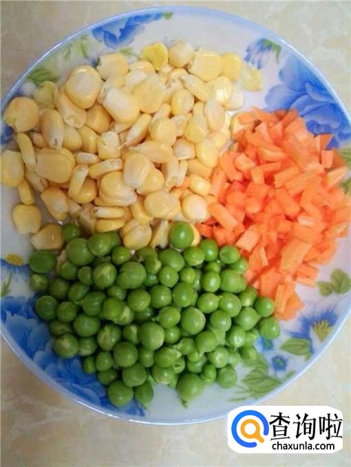 制作芝士焗饭比较简单,首先,我们要准备煮好的米饭,最好是隔夜饭,这样口感比较好,然后将胡萝卜切丁,将玉米粒和豌豆洗净备用。
