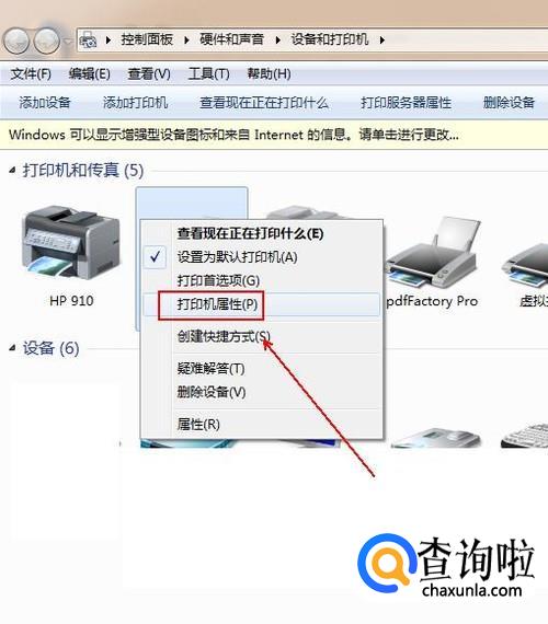 右击正在使用的打印机,在弹出的菜单列表中选择“打印机属性”选项。