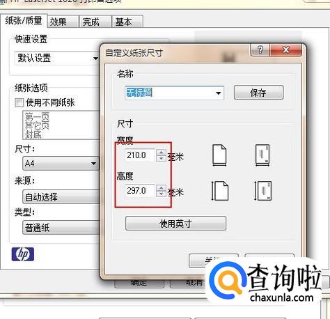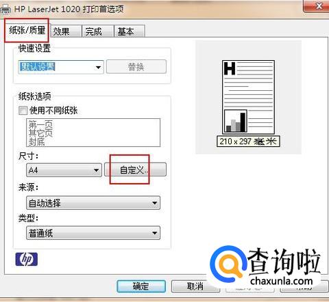 在纸张/质量选项卡下点击“自定义”选项。