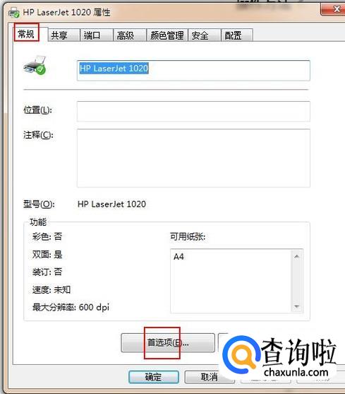 在打印机属性窗口中依次选择“常规”-“首选项”选项。