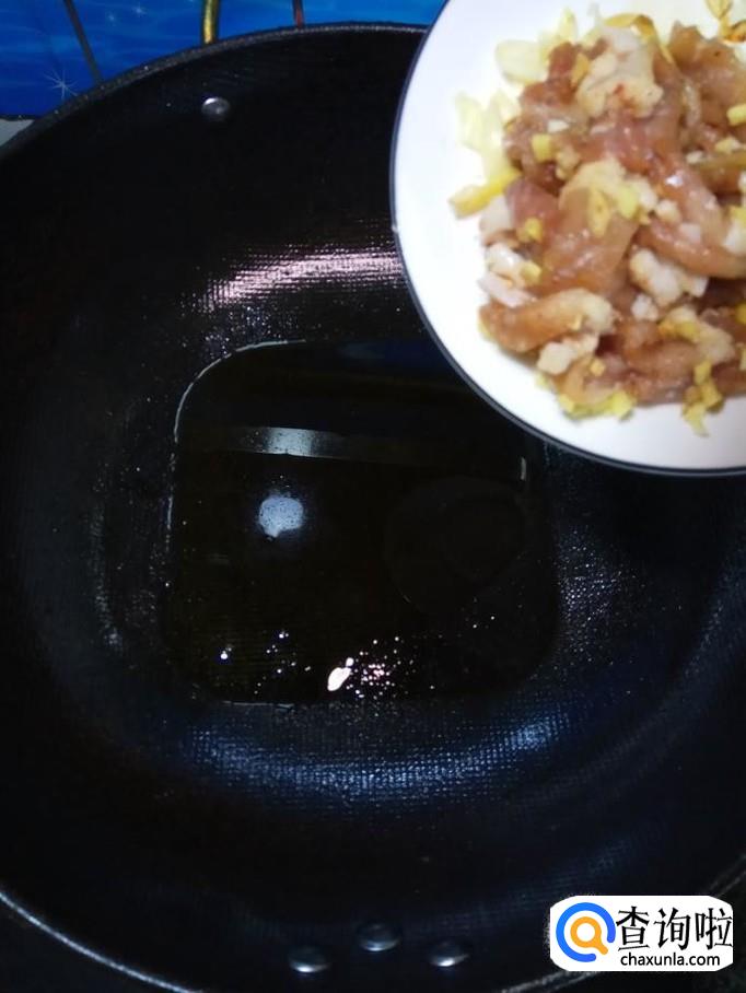 炒锅中放入适量油,油热后将腌好的肉丝倒入锅中,炒至八成熟。