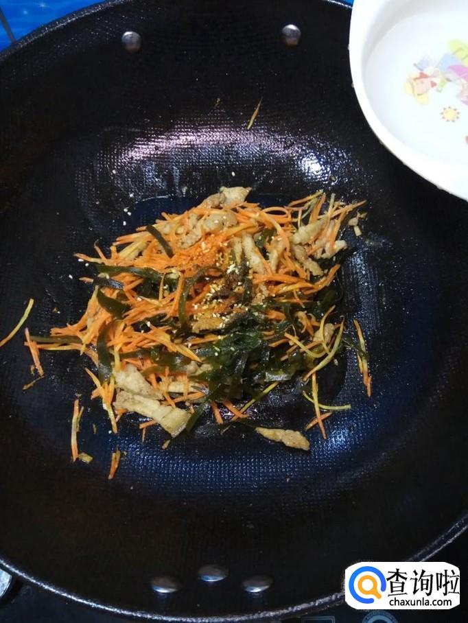 将准备好的海带丝和胡萝卜丝倒入锅中,翻炒均匀。