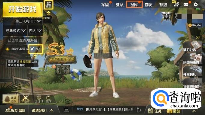 最常见的方法就是使用原有的衣服分解来获得服饰币,首先打开刺激战场,进入大厅,点击右上角"仓库"。