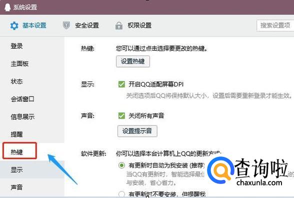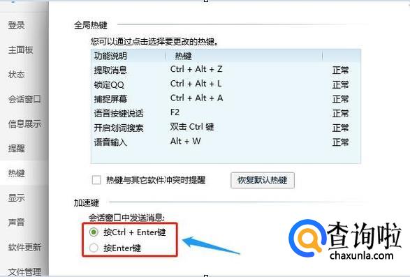 接着就会弹出系统设置对话框,在该对话框我们点击左侧的“热键”,点击设置热键以后我们在页面最下面找到发送消息的热键设置,选择其中一个为发送键以后,那么剩下的另外一个就是换行键了;