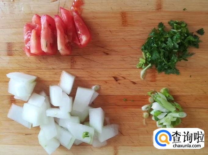 把冬瓜洗净去皮去籽切成片,西红柿切成块,香菜切末,葱切葱花。