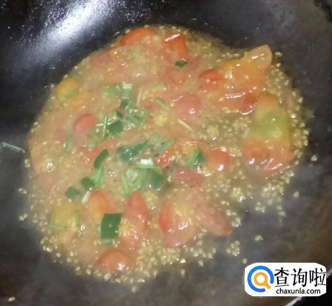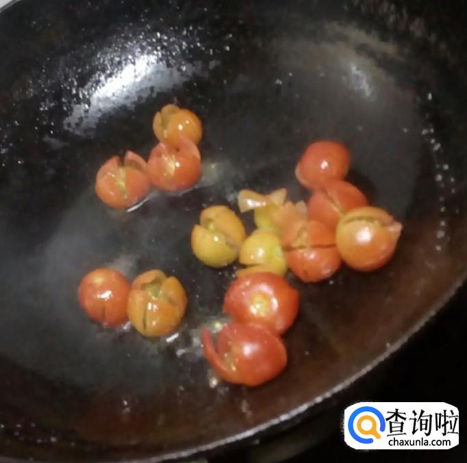 把锅预热,放油放点胡椒粉,加入樱桃番茄,翻炒待出汁加入青椒和葱花碎块,大火翻炒,炒5分钟左右。