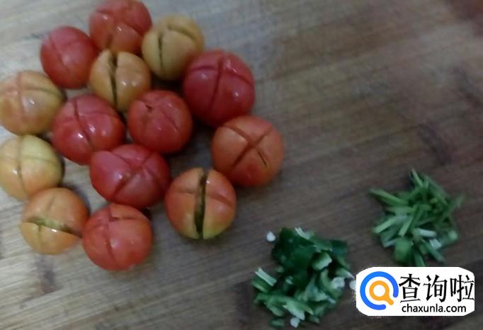 把樱桃番茄,葱,青椒洗好切块