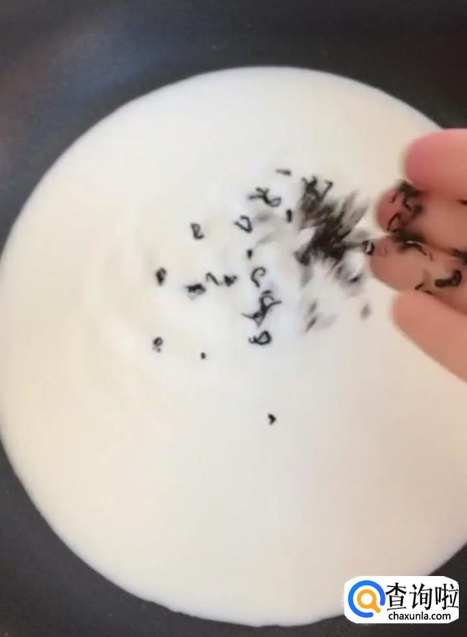 接着我们将牛奶倒入锅中,放入茶叶煮开,将茶叶捞出扔掉
