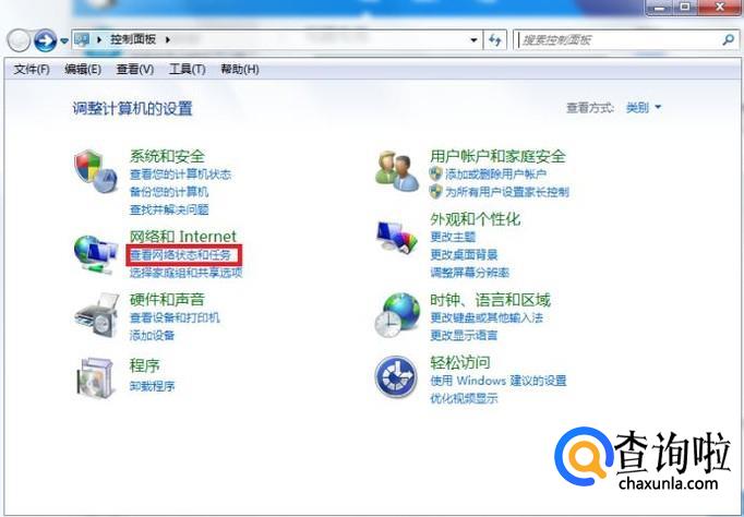 进入控制面板后,点击“网络与Internet”下属的“查看网络状态和任务”这一选项。