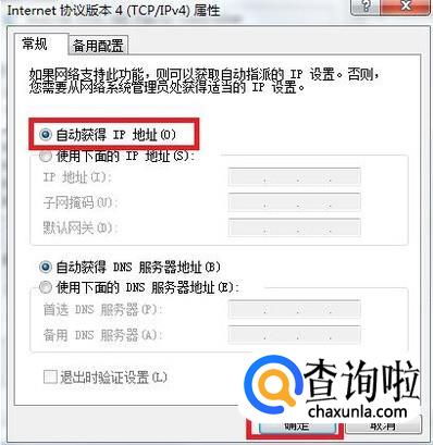在Internet 协议版本 4(TCP/IPv4)属性的常规界面汇总,在IP地址一栏,选择“自动获取IP地址”的选项后,点击下方的“确定”按钮即可。