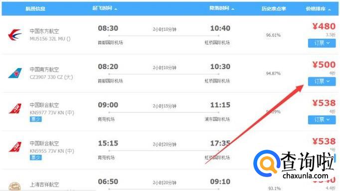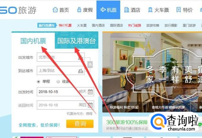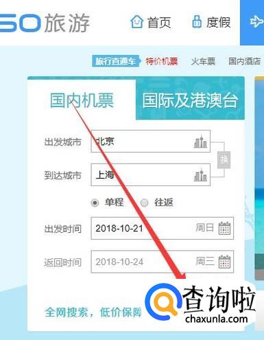 以查询国内机票为例,设置好出发城市、到达城市、以及出发时间,点击“查询”即可。