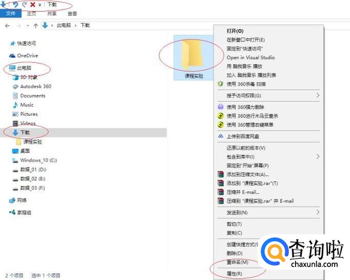 如图所示,鼠标右击"课程实验"文件夹。弹出快捷菜单,选择"属性"项。