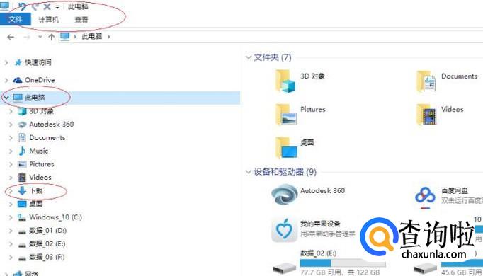 打开"文件资源管理器"程序窗口,如图所示。展开左侧树形目录结构,选择"此电脑→下载"文件夹。
