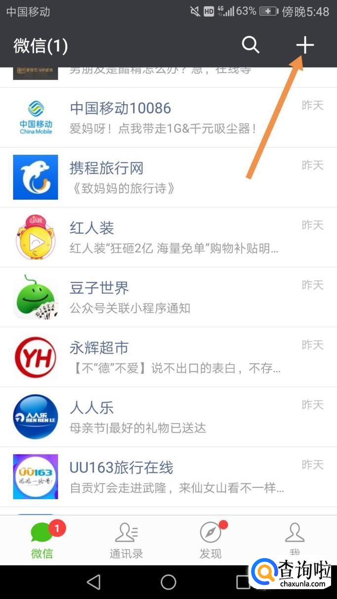 首先打开微信,点击右上角的+号,如下图。