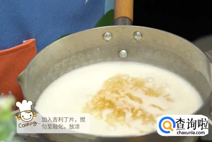 之后再加入用水泡软的吉利丁片,搅匀至融化,放凉。