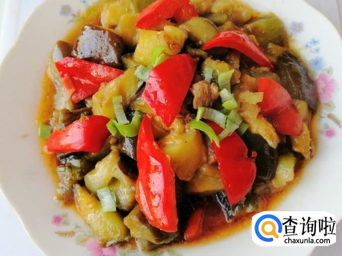 圆茄子一个,红色菜椒一个,适量葱和干红辣椒,适量熟肉,生抽、食盐适量