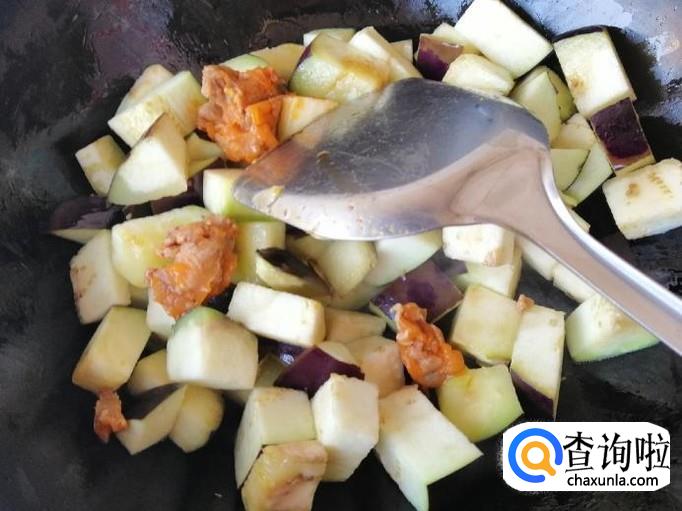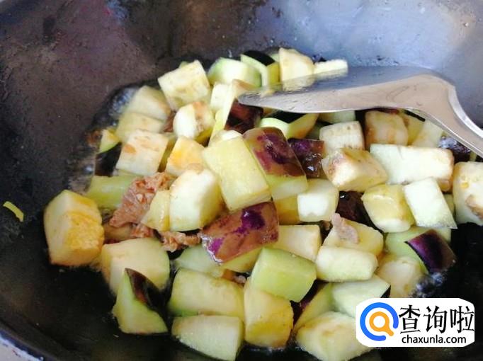 炒锅放油,油热后先放葱花和干辣椒炝锅,炒出香味后,加入备好的茄子块,用铲子把茄子块,快速翻炒均匀。
