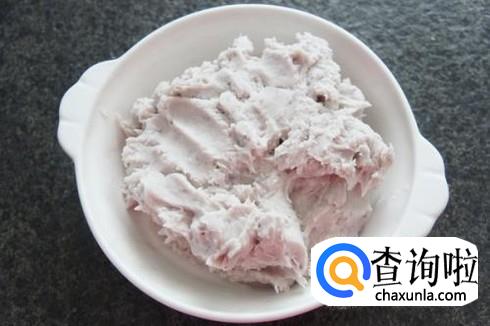 将芋头去皮,洗净,放到蒸炉里蒸熟,然后装到盘子里,加少量清水压成泥,再加入糖粉搅拌均匀。