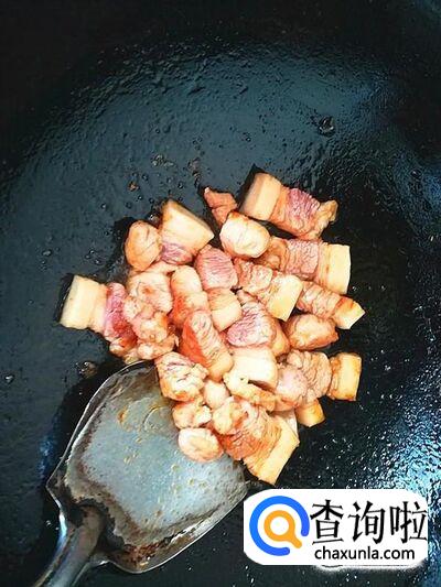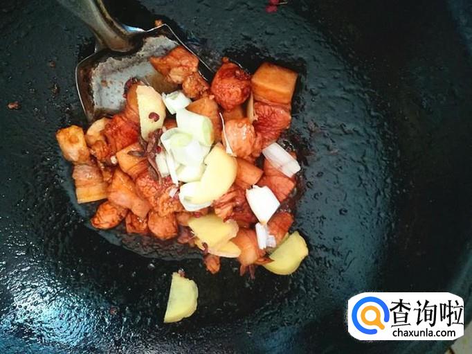 这时,再倒入切好的五花肉炒到肉上色为好,再加入准备好的葱、食盐、生姜、花椒、八角等炒片刻。